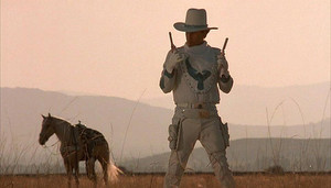 Eighties Man Tom Berenger plays Rex O’Herlihan (“The Singing Cowboy”), battling not only an Evil Cattle Baron but also his own uncertainty as a cowboy of the old school flung into a modern Western, a whiter-than-white good guy in a world of moral greys. He drinks milk (unless he’s in a tough bar, in which case he has to order the aforementioned whisky with a human hair in it), only ever shoots the guns out of people’s hands and is perfectly chaste and honourable in his dealings with ladies – even when those ladies are less than chaste themselves. In the end, when confronted with another Good Guy, Rex has to decide whether to stick to his guns – so to speak – or accept this new moral landscape and adopt the new ways in order to win.