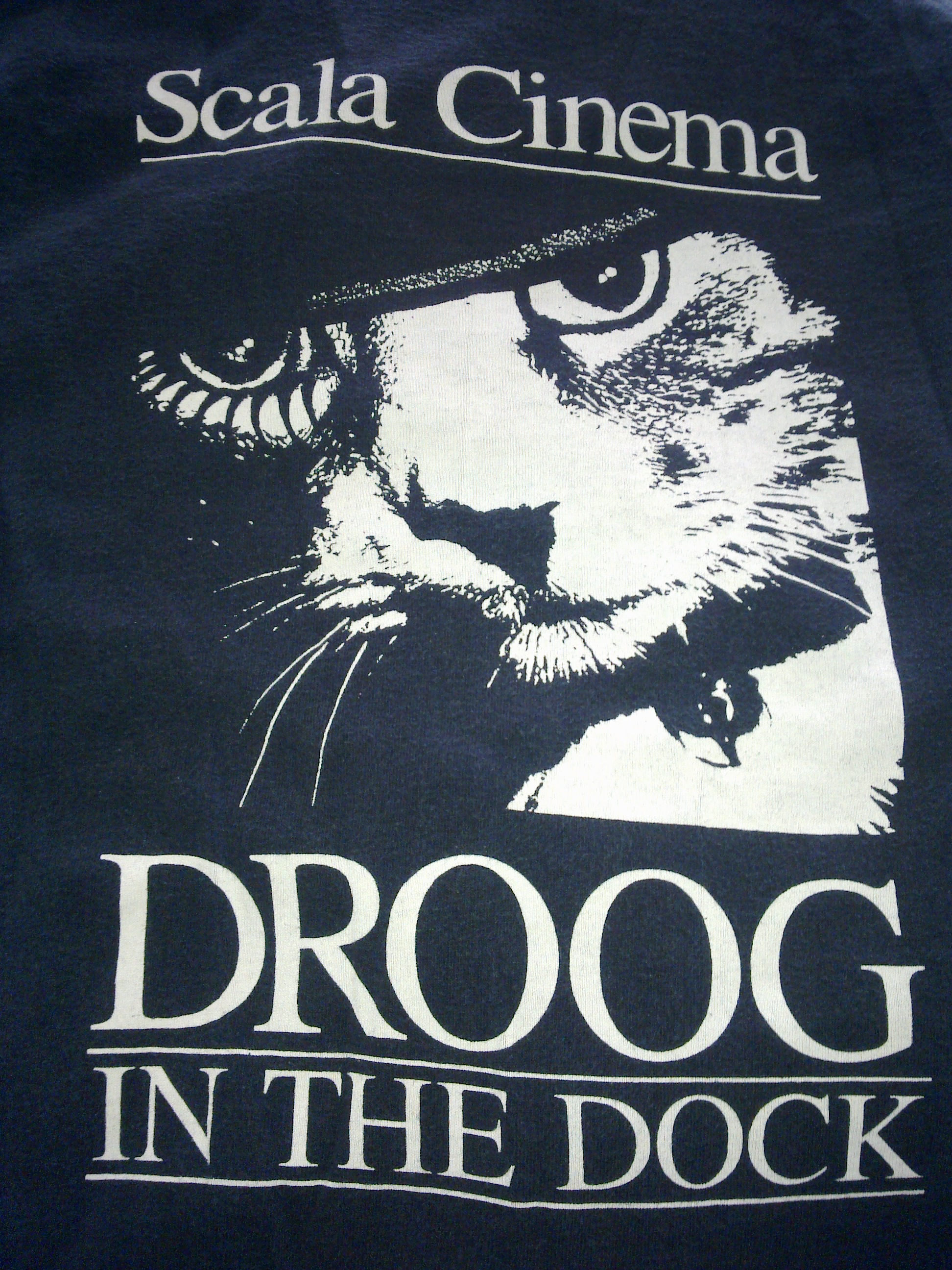 As any fule kno, A Clockwork Orange wasn’t banned in this country: it was withdrawn, at the request of Stanley Kubrick, after reported incidents of copycat violence allegedly escalated into death threats on the director himself. So it wasn’t the Obscene Publications Act that brought the Scala down when they imported a print into the UK for a one-off screening: it was copyright. Kubrick and Warner Brothers took the Scala to court for a battle they had no chance of financing, let alone winning. Fundraising efforts were made (including the t-shirt pictured above), but they all came to nothing: the Scala went into liquidation, and closed its doors in 1993.
