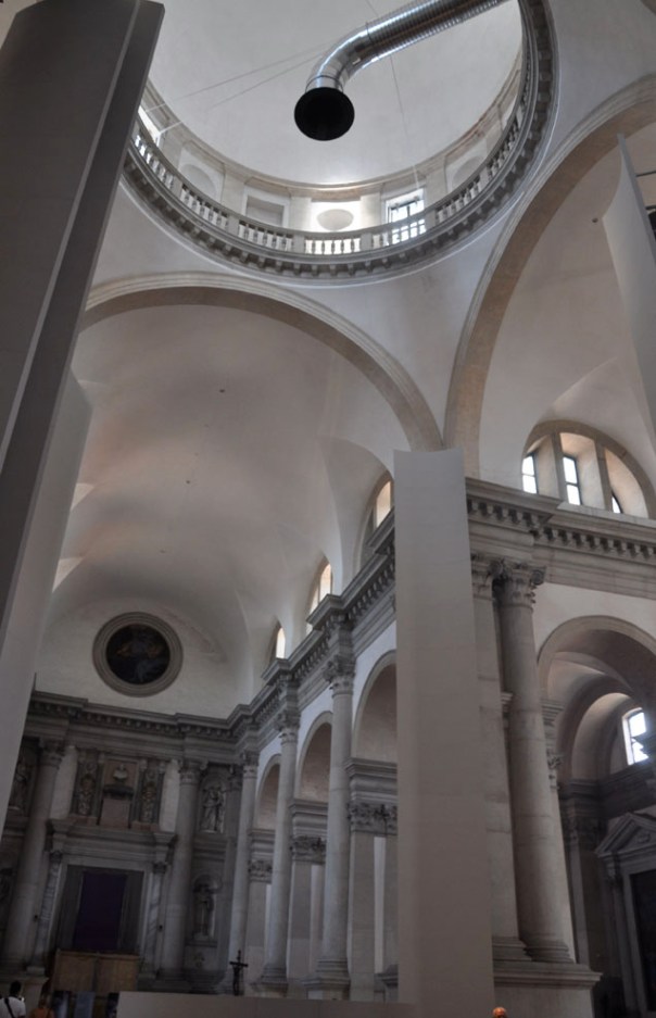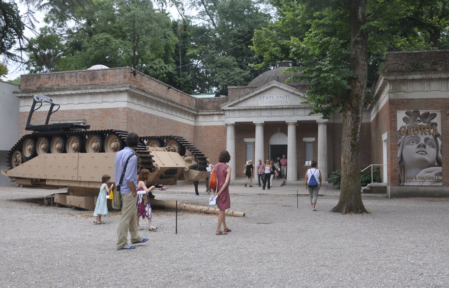 My visit started with a day at the Giardini. The work I was most looking forward to here – Mike Nelson’s installation in the British Pavilion and Christian Boltanski’s in the French – didn’t disappoint; indeed in the main the work I saw in the Giardini was good if often rather safe and, though there’s a lot to see, a day spent wandering through a public gardens can never really count as hard work. There were low points though, two in particular in pavilions I greatly enjoyed last time. One of my strongest memories of Venice in 2009 is Mark Lewis’s film in the Canadian pavilion so the dullness of this year’s offering – paintings by Steven Shearer – was a disappointment. And the work of Jennifer Allora and Guillermo Calzadilla for the US pavilion seemed rather trite, placing style before substance. Track and Field, a running machine on an upturned tank, outside the entrance, put me off the show before I get through the door, loudly announcing ‘look, over here, we’re the Americans’. Algorithm, a functioning ATM built into a pipe organ which plays when a card is inserted is amusing enough – and useful in that I needed cash – but nothing more. Having liked the simplicity of Allora and Calzadilla’s Revolving Door in 11 Rooms at Manchester International Festival, for me their show here was an ostentatious disappointment, though in fairness I didn’t see the aeroplane seat sculptures in use as sites for gymnastic performances. Without the tank I might have been better disposed to the work on show but ultimately this feels like work that knows there are questions to address about patriotism and America’s place in the world and feels that this could well be the place to do it but prefers to offer surface glitz.