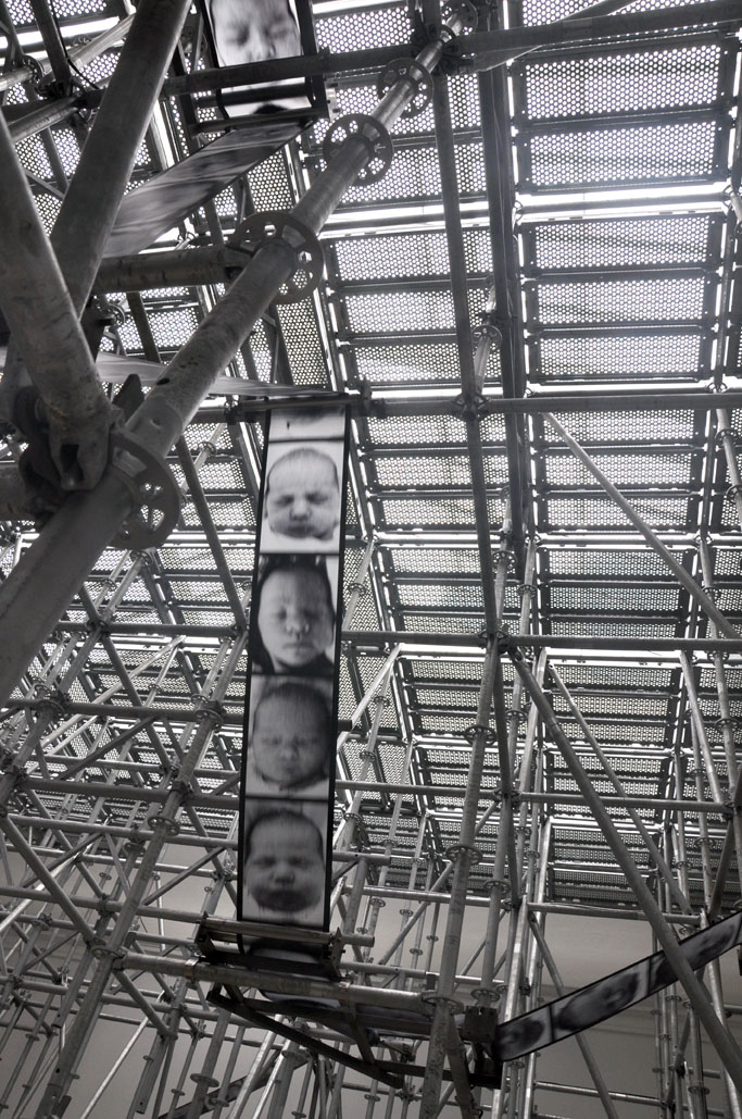 France is represented here by Christian Boltanski at his best. His exhibition Chance features four connected works. In The Wheel of Fortune, in the central space, a print stream of babies’ faces passes though complex metal scaffold, seemingly continuously generating more and more people and raising questions in my mind about both overpopulation and the accident of each individual birth. Periodically a bell rings and the strip stops, a baby’s face appears on the monitor, chosen by chance. In the side spaces digital counters – The Births and The Deaths, two parts of the work Last News from Humans – tick over continuously; 200,000 more people are born each day than die. Be New, in the back space, is a projection of a constantly changing composite face; visitors can press a button to freeze the changing mismatched face on the screen. If chance works in your favour and the three segments on the face match, you win the work. The odds of this happening are remote but the mismatched faces in which children and adults are mixed are reason enough to keep pressing the button.