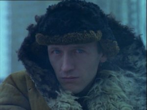 The camera moves slowly across the surface of a frozen lake. On its bank, hunched in the snow, we find a young man warming himself against a fire. The man raises his head and then slowly turns to look directly at us, wearing an expression that is hard to read; it could be a look of curiosity, perhaps, or one of reproach. The camera then cuts to another location, where a woman cries as she watches silent footage of a smiling child on television, before it brings us back to the young man who appears to be wiping a tear from his eye.