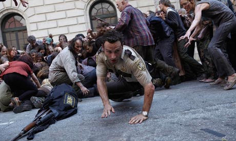 Even TV is in on the act now. The Walking Dead, which started its second series on FX a few weeks ago, is the mainstream face of zombie culture. When the budget requirements for filling the screen with shambling hordes of the undead in deserted cities are taken into account, it seems surprising that The Walking Dead Season Two was even commissioned. Even more surprising given that the first season descended into virtually zombie-free, soapy shrillness by the end of its meagre six-episode run. I began keeping a tally of zombies per episode. Once, there were only two zombies in a whole show. Two! Unbelievable. I wonder how the zombies felt about this – you can’t be a horde of two. It’s just embarrassing.