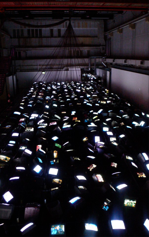 It was the sound that hit me first. It’s there like a wall before you get through the doorway and into the space. A thousand and one is a lot of tellies and the noise they make when all switched on is cacophonous. The space is dark. Well not completely dark but lit almost solely by those thousand and one televisions. Looking out across the installation from above, the screens form a glowing pattern across the space, disappearing out of sight in a couple of places. Though the mezzanine at the entrance is high above the gallery floor, it’s easy to make out the repetitions – there are only five analogue channels after all – though some screens are much clearer than others. Mostly the colour is surprisingly muted but there are moments when lots of screens suddenly become intensely coloured, usually from adverts or pre-programme idents. My first visit was made before the demise of analogue BBC 2, so the few blank screens at that stage were due to the equipment failure that is an inevitable feature of the installation. The televisions here are reaching the end of their useful lives; they are large, unwieldy cathode ray tube sets gathered from council recycling schemes. By my second visit, after the BBC 2 signal had been switched off, a fifth of the screens had become snowy. With the switch-off of the rest of the analogue channels today, all the screens will broadcast the same fuzzy nothingness. The cacophony will be reduced to a hiss.