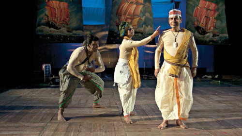 As the rain that had threatened throughout The Tempest finally began to fall towards the end of the play, I felt it was fitting that this particular production should climax with the audience getting wet. After all, the play begins with a shipwreck, depicted on stage by the actors carrying model ships on their arms and swirling as Ariel (Shimul Yousuf) whipped up a storm. It was an inventive and elegant way to open this Bangladeshi version of Shakespeare’s play, and it set the tone for the next two hours.