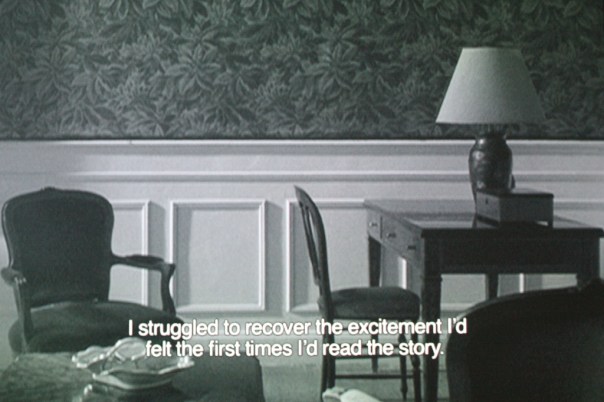 And what of last week’s programme in particular? Well, that’s a trickier one. In the main, I wasn’t blown away by the work but, as is the nature of these things, even the pieces I didn’t like gave me something to think about. One of the pieces that interested me most was Alejandro Cesarco’s The Two Stories (2009), in which a narrator retells his own earlier telling of a story in a empty space as the camera investigates the stillness of the room and the space beyond the window. Although this work has much in common with a short narrative film, the way the story loops in on itself turns this into an exploration of storytelling and the role of the witness.