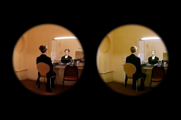 There are two video works on show at Turner Contemporary at Margate at the moment, neither of which is actually shown in the gallery space. Lindsey Seers, who often constructs a space within a space as part of her work, has elected to exhibit in a ‘Secret location within Turner Contemporary’; to see Entangled² one must meet at the information desk – effectively this means loitering in the foyer until a member of staff armed with a sheet of stickers approaches and asks if you want to see the film – and be led out of the gallery and through the carpark to the space. Here Seers hasn’t felt the need to construct a bespoke screening space – she is using the gallery’s loading bay which effectively acts as a strange concrete theatre. Two large, inflatable white spheres – a bit like giant white beachballs – become the screen onto which the film is projected. For a work shown in a seaside town and taking as its subject ideas around double identities, and the artist’s great-great-uncle who had Heterochromia, meaning his eyes were different colours, the twin spheres clearly become more than a projection screen.