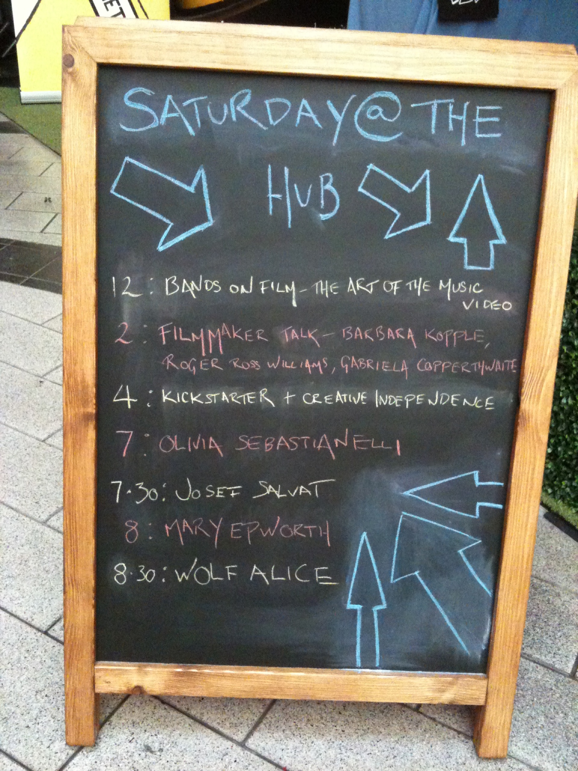The Hub is normally a nightclub and I remember it as being dark and dingy, plus my feet kept sticking to the floor. This year, the aim is to make it more welcoming and encourage the audience to treat it as a meeting place / hangout. A volunteer team of six, we add extra lighting and seats and decorate the wall with film and sponsor posters. We try to make sure every feature film is represented and after a few ‘intense discussions’ we manage to get through the whole day without killing each other. (When I come back later in the festival, my feet still stick to the floor, but it looks great and it’s packed.)