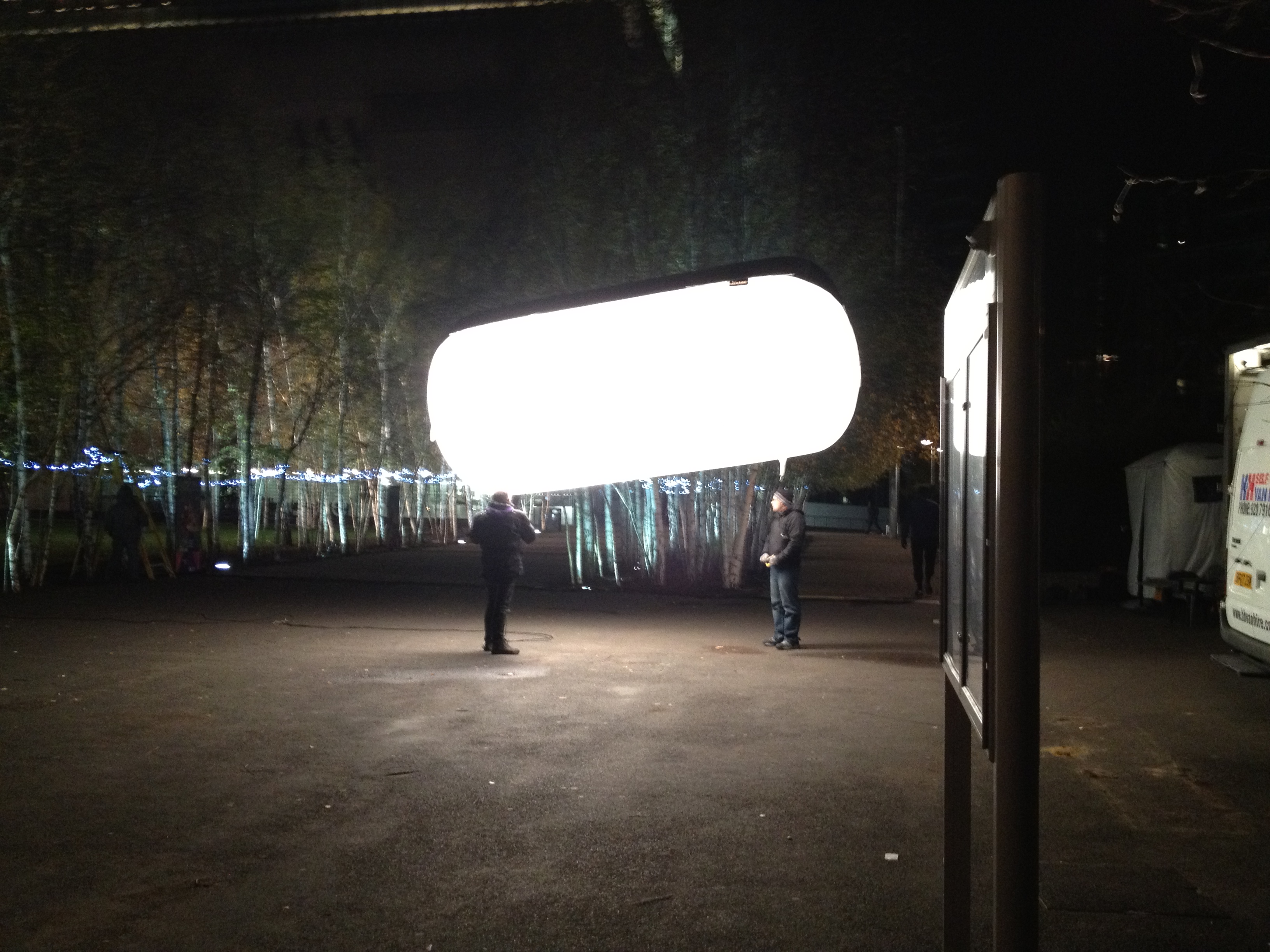 My scene was to be shot inside the Tate Modern turbine hall, at that time hosting Tacita Dean’s “Film” installation. But first there was a scene to be shot with the two leads outside the gallery. It won’t be a surprise to anyone to learn that there’s a lot of waiting around on film sets, but it maybe isn’t until you have to spend three hours with the other extras huddling under an umbrella gas heater on the Southbank after midnight on a freezing winter night that you really know what waiting around is. It was so cold that venturing more than a few yards from the heater was foolhardy, which meant I didn’t get to see much of Gavin and his stars at work, although I did get to see the lighting crew wrestle with a balloon light which looked like a giant glowing Nurofen that wouldn’t stay put in the wind.