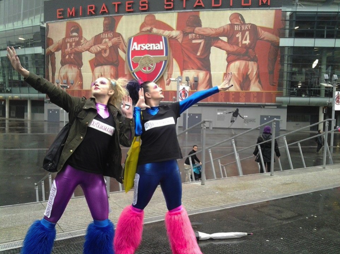 Over the course of the two weeks I was persuaded that to take part would be a shared experience that we would never forget, so we got to work developing a slightly bonkers outfit and a ninety-second routine. We collected ideas from friends, family and colleagues, downloaded some free editing software and tried to merge a few suggestions together into a backing track. We also managed to purchase striking metallic catsuits in contrasting colours, and accessorised them with fluffy leg warmers.