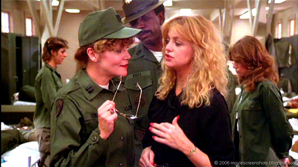 Widowed on her wedding night when her workaholic husband expires immediately after sex, distraught Judy joins the army. While much of the comedy comes from her struggle to adjust to the privations of army life, Judy gradually comes to realise that it offers her a freedom and independence she’s always been without. Her story is complete when she rejects marriage to a handsome, but controlling and philandering French doctor (Armand Assante) for whom she has given up her promising army career, and casts her wedding veil off her head into the sky where it is borne away by the wind and she strides away into an uncertain future.