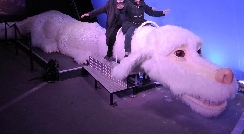 The existence of Bullyversum doesn’t mean that the studio tour is entirely passive and serious. There are several displays dedicated to playing around with effects technology: you can stand in front of a weather map reading the forecast, or dive out of the way as a flying dragon approaches you. (The Belated Birthday Girl comes off worst in these scenes, as her blue and green checked coat makes her semi-translucent whether they’re using blue screen or green screen FX.) At the climax of the tour, the trickery is more old school, as all of us collaborate on a small improvised scene involving a mocked up train carriage and a background painted on a roller.