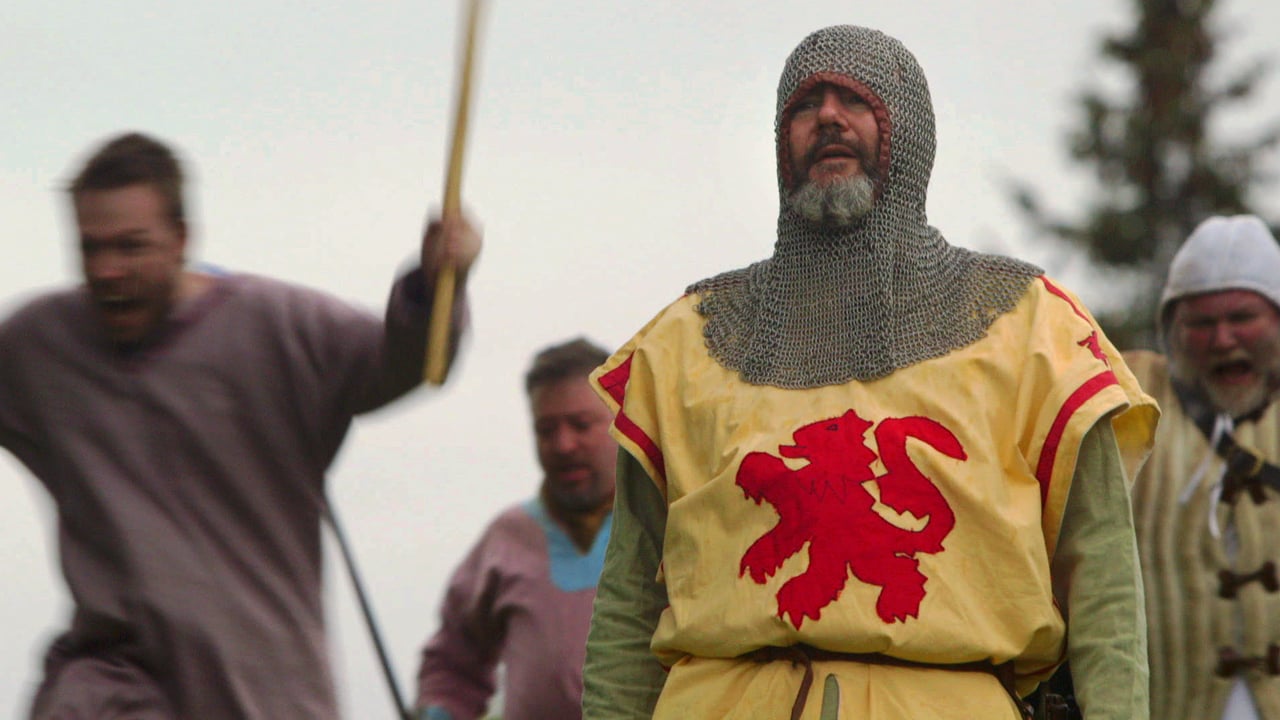 Various little episodes pass before us at each stop, without obvious relation to the ‘clash’. The camera dwells on a dog penned up in an old-fashioned red telephone booth in a village; the dog’s owner explains that it’s necessary to stop him from chasing the cars. We find ourselves at Loch Ness, where a local man called George has made a large fibreglass model of a hump that he put in the loch and photographed, to help keep people interested in Nessie. At another stop, Moffat and the woman who plays fiddle in the band find themselves listening to a local man of 78 who – in a moment of real poignancy – tells them how he found the courage to propose to the young woman who became his wife. Now that she’s dead, he finds the hardest thing is getting up in the morning. In a startling sequence, Sheila Stewart skins a rabbit at a sink while talking to camera in a monologue on her life. The band’s van breaks down and has to be rescued by a tractor. In a rural shot, a dog shepherds cows. And on a hillside Moffat, in mediaeval armour, joins in with a battle re-enactment group, though more in horseplay than in earnest.