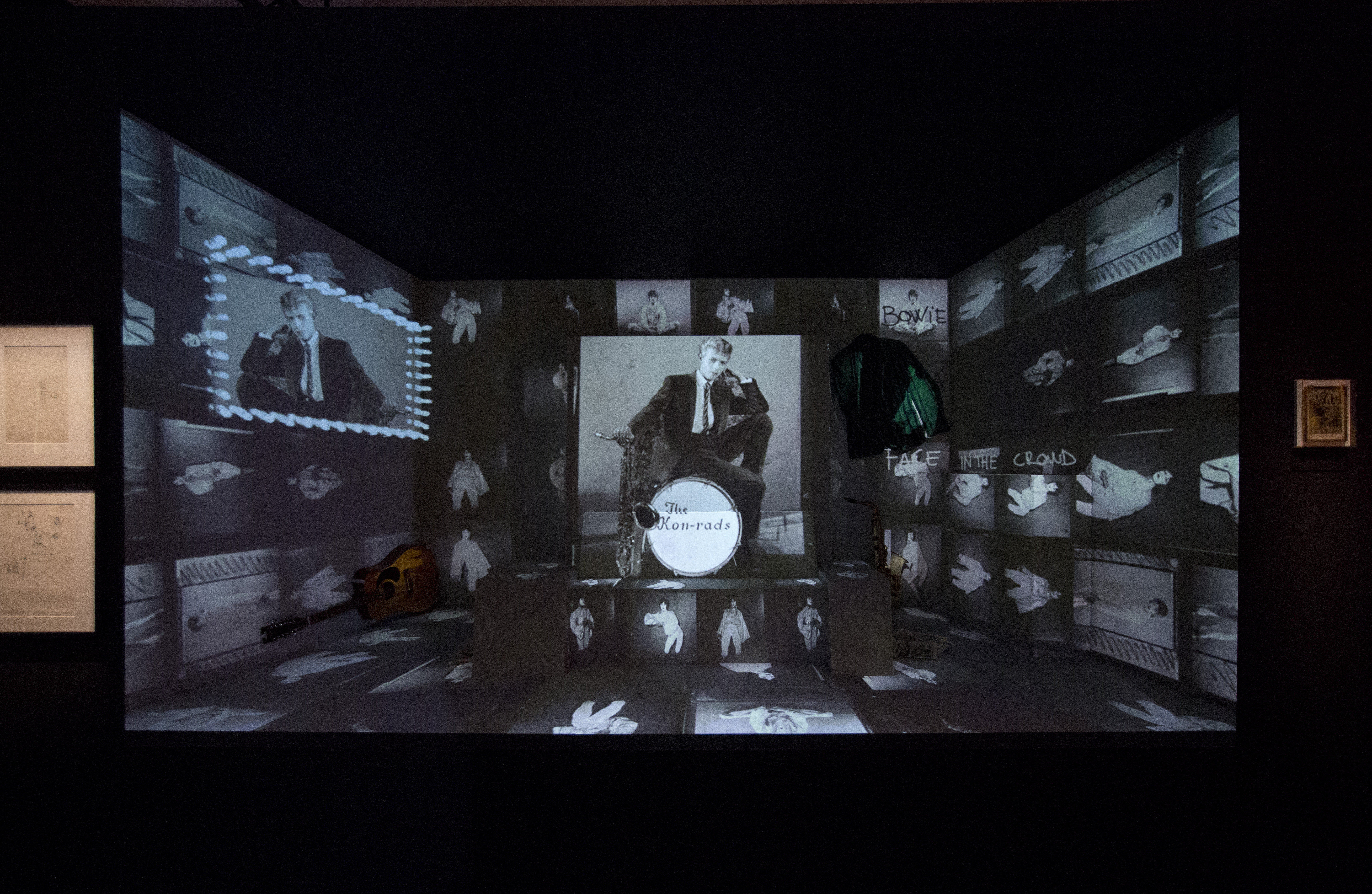 A curated exhibition is an appropriate way to remember David Bowie (and a million times better than singing Space Oddity with a giant spider crawling across your face – sorry Lady Gaga). The curators had full access to his archives and I’m not sure if he ever threw anything away. We get to see gig posters, costume sketches for his many teenage bands, storyboards, works in progress, paintings, books and performance films projected onto vast walls, like moving Bowie wallpaper. Here’s that 1972 Top of The Pops performance of Starman, when Bowie, clad in a quilted rainbow, puts his arm around Mick Ronson (in a silver-trimmed white jumpsuit – you don’t get many of those in Hull) as they sing the chorus together. There he is, hair dyed a sombre brown, singing Heroes. Here’s Kansai Yamamoto, designer of that black jumpsuit with the crazy trousers, talking about how he designed it for a woman. But here’s Bowie rocking it like a boss on the Aladdin Sane tour.