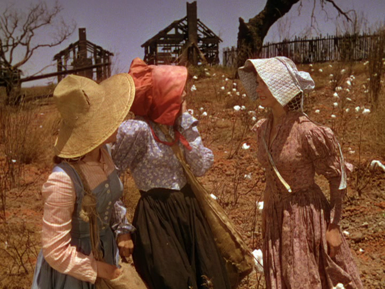 Scarlett O’Hara’s story is one of riches to rags to riches again, and of course what she wears throughout the film reflects this. Clothing is a signifier of social status and wealth in any film but in Gone With The Wind this fact has particular resonance. The wealth of the South came from cotton. Strict dress codes apply, particularly for women. At key points in the story, items of clothing are given as gifts or rewards or tokens of affection. They are the means through which a woman can recreate herself, the key to a better future, badges of success, markers of disgrace. They can oppress or liberate.